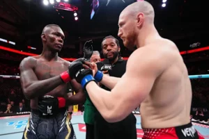 Adesanya (24-6) started brightly, showcasing his trademark striking precision. The former two-time middleweight champion controlled distance with a sharp jab and damaging leg kicks, while also defending Pyfer’s early attempts to clinch and secure takedowns.